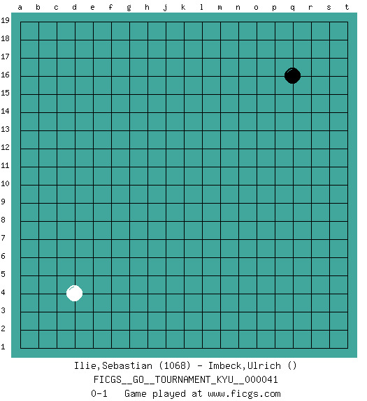 Last move : 0-1 2007 September 3 18:59:30 [Event "FICGS__GO__TOURNAMENT_KYU__000041"] [Site "FICGS"] [Date "2007.08.03"] [Round "1"] [Black "Ilie,Sebastian"] [White "Imbeck,Ulrich"] [Result "0-1"] [Rating 1 "1068"] 1.q16 d4 0-1 This go game has been lost on time (started : 2007.08.03 11:16:18) Here are the names of the openings (joseki) played in the four corners : Corner d4 : d4 0-1 Hoshi (Hwajeom, Seongjeom, Xingwei`) 4-4 Point. The star or hoshi (4-4) point, emphasizing influence at the potential expense of territory. Player White won this Go (weiqi, baduk) game. Follow this game move after move (download)Don't overlook the edge of the board. (Anonymous) Art is the triumph over chaos. (John Cheever)