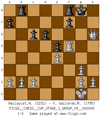 Last move : 1-0 2022 August 11 20:29:6 [Event "FICGS__CHESS__CUP_STAGE_1_GROUP_09__000005"] [Site "FICGS"] [Date "2022.07.16"] [Round "1"] [White "Hallqvist,Niklas"] [Black "V. Gallardo,Miguel"] [Result "1-0"] [WhiteElo "2231"] [BlackElo "1795"] 1.e4 e5 2.Nf3 Nc6 3.Bb5 Nf6 4.O-O d6 5.d4 Bg4 6.dxe5 Bxf3 7.Qxf3 dxe5 8.Rd1 Bd6 9.Bg5 O-O 10.Bxc6 bxc6 11.Nd2 Qc8 12.Bxf6 gxf6 13.Nc4 Kh8 14.Qxf6+ Kg8 15.Nxd6 cxd6 16.Rd3 Rd8 17.Qh6 Qg4 18.Rg3 Qxg3 19.fxg3 Rab8 20.Rf1 Rf8 21.Qg5+ Kh8 22.Qf6+ Kg8 23.Rf5 h6 24.Qxh6 1-0 Ruy Lopez : Berlin defense, 4.O-O, d6 Kingside Castling by player White (move 4) Kingside Castling by player Black (move 9) Player White won this chess game. Follow this game move after move (download)Fischer Chess play was always razor-sharp, rational and brilliant. One of the best ever. (Dave Regis) Verschiedene, sehr schätzbare und im Laufe des Lebens nützliche Eigenschaften des Geistes können durch das Schachspiel erworben und gekräftigt werden, so dass sie zu Gewohnheiten werden, die uns nie im Stich lassen. (Benjamin Franklin) Cuando tu no sabes absolutamente que mas hacer, es tiempo de entrar en pánico. (John van der Wiel) J'apprécie les joueurs d'est-indienne, c'est grâce à eux que je nourris ma famille depuis tant d'années. (Petrosian) There are more things in heaven and earth than practically anywhere else. (Unknown)