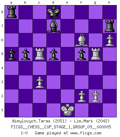 Last move : 1-0 2022 October 3 19:24:31 [Event "FICGS__CHESS__CUP_STAGE_1_GROUP_09__000005"] [Site "FICGS"] [Date "2022.07.16"] [Round "1"] [White "Nimylovych,Taras"] [Black "Lim,Mark"] [Result "1-0"] [WhiteElo "2051"] [BlackElo "2042"] 1.e4 e6 2.Nc3 d5 3.d4 Bb4 4.e5 c5 5.a3 Bxc3+ 6.bxc3 Ne7 7.Qg4 Qc7 8.Bd3 c4 9.Be2 Qa5 10.Bd2 Nf5 11.h4 Qa4 12.h5 h6 13.Nf3 Qxc2 14.Nh4 Rg8 15.Nxf5 exf5 16.Qg3 Qb2 17.Rd1 Kf8 18.Bxc4 dxc4 19.d5 Qxa3 20.Bf4 Qe7 21.e6 Qf6 22.Bxb8 Rh8 23.Rd4 fxe6 24.Rxc4 Bd7 25.Be5 Qg5 26.Qxg5 hxg5 27.Rc7 Ke8 28.Bxg7 Rh7 29.h6 b5 30.Rh5 exd5 31.Rxg5 Kd8 32.Rc5 a5 33.Bf6+ 1-0 French defense Player White won this chess game. Follow this game move after move (download)Chess is mental torture. (Garry Kasparov) Pläne sind die Träume des Verständigen. (Ernst Freiherr von Feuchtersleben) El estómago es una parte esencial del maestro de Ajedrez. (Bent Larsen) D'abord les bases : Jouez et étudiez, puis étudiez et jouez, ensuite jouez et étudiez, puis étudiez et jouez. Deuxièmement : Donnez toujours le meilleur de vous-même ! (Ken Smith) Political correctness is subjecting us to gross incompetence. (Johann Piek)