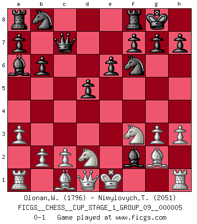Last move : 0-1 2022 September 23 10:33:58 [Event "FICGS__CHESS__CUP_STAGE_1_GROUP_09__000005"] [Site "FICGS"] [Date "2022.07.16"] [Round "1"] [White "Olonan,Wilfredo Olanka"] [Black "Nimylovych,Taras"] [Result "0-1"] [WhiteElo "1796"] [BlackElo "2051"] 1.d4 Nf6 2.h3 d5 3.e3 e6 4.a3 b6 5.g3 c5 6.dxc5 Bxc5 7.Nf3 O-O 8.Bg2 Ba6 9.Nbd2 Qc7 10.Bf1 Bxe3 11.Bg2 Bxf2+ 0-1 This chess game has been lost on time (started : 2022.07.16 1:8:9) Queen's pawn game Kingside Castling by player Black (move 7) Player Black won this chess game. Follow this game move after move (download)Castle early and often. (Rob Sillars) Je mehr wir mit Computern analysieren, desto mehr glauben wir an Verteidigung. (Vladimir Kramnik) Los problemas de Ajedrez exigen del compositor las mismas virtudes que caracterizan todo el arte de valor: originalidad, invención, concisión, armonía, complejidad e insinceridad explendida. (Vladimir Nabokov) C'est la seule position que je connaisse où les deux camps sont mals. Propos prêtés à V. Anand. 'preceded by its own quotation yields a falsehood' preceded by its own quotation yields a falsehood. (W. V. O. Quine - Set Theory And Its Logic, 1953)