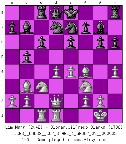 Last move : 1-0 2022 September 11 13:52:23 [Event "FICGS__CHESS__CUP_STAGE_1_GROUP_09__000005"] [Site "FICGS"] [Date "2022.07.16"] [Round "1"] [White "Lim,Mark"] [Black "Olonan,Wilfredo Olanka"] [Result "1-0"] [WhiteElo "2042"] [BlackElo "1796"] 1.d4 d5 2.c4 dxc4 3.e4 c6 4.Bxc4 e6 5.Nf3 h6 6.Nc3 Ne7 7.h4 g6 8.Bb3 Bg7 9.Bf4 Nd7 10.Qd2 b5 11.O-O Bb7 12.Rac1 Rc8 13.Rfd1 1-0 This chess game has been lost on time (started : 2022.07.16 1:8:9) QGA : 3.e4 Kingside Castling by player White (move 11) Player White won this chess game. Follow this game move after move (download)A good player is always lucky. (Jose Raul Capablanca) Ein Schachgenie ist jemand der verdammt gut Schach spielt. (Jonathan Levitt) Ayuda a tus piezas para que ellas te puedan ayudar. (Paul Morphy) Il n'y a pas de prix trop élevé au scalp de l'ennemi. (Koblentz) Tomorrow's what you make of it. (Horatio Caine, C.S.I. Miami)