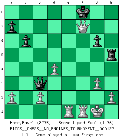 Last move : 1-0 2022 August 5 15:39:25 [Event "FICGS__CHESS__NO_ENGINES_TOURNAMENT__000122"] [Site "FICGS"] [Date "2022.07.17"] [Round "1"] [White "Hase,Pavel"] [Black "Brand Lyard,Paul"] [Result "1-0"] [WhiteElo "2275"] [BlackElo "1476"] 1.e4 d5 2.exd5 Qxd5 3.Nc3 Qd8 4.g3 g6 5.Bg2 Bg7 6.Nf3 Bxc3 7.bxc3 Bg4 8.O-O h5 9.Qe1 Bxf3 10.Bxf3 c6 11.d4 h4 12.Bf4 hxg3 13.Bxg3 Na6 14.Rb1 b6 15.Bxc6+ Kf8 16.Bxa8 Qxa8 17.Qe2 Rh3 18.Qxa6 Nh6 19.Qe2 Nf5 20.Rbe1 e6 21.Qg4 Nxg3 22.fxg3 Rh5 23.Qe4 Qc8 24.Qxe6 Qxc3 25.Qxf7+ 1-0 Scandinavian (centre counter) defense Kingside Castling by player White (move 8) Player White won this chess game. Follow this game move after move (download)Chess is so inspiring that I do not believe a good player is capable of having an evil thought during the game. (Wilhelm Steinitz) Es hat in meinem Leben Zeiten gegeben, in denen das Schachspiel, wenn nicht zum Lebenszweck, so doch zu einem regelrechten Lebensersatz geworden ist. Man fühlt sich in solchen Zeiten nicht so, als besäße man eine göttliche Gabe, sondern eher so, als sei man von ihr besessen. (Garry Kasparov) ¡Examina movidas que hagan daño! Un buen ojo for movidas desvastantes es mucho mas importante que el conocimiento de principios estratégicos. (Purdy) Botvinnik disait en comparant les échecs à la musique: Il existe une science dont le but est l'étude de l'acoustique et des sons. Mais il y a aussi un art qui se sert de l'océan des sons : c'est la musique. De toute évidence, il en est de même pour la pensée. La logique est l'étude des lois de la réflexion et les échecs reflètent, en tant qu'art, le côté logique de la réflexion, sous la forme d'images artistiques... Extrait de Fischer - Spassky, Reykjavik 1972 par Alexander & F. Wyndham (Ed. Solar), p 37. You must have a dream in order to have it come true. (A.P.J. Kalam)