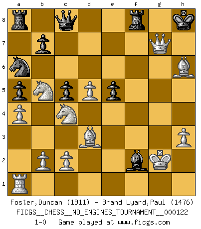 Last move : 1-0 2022 October 19 17:51:32 [Event "FICGS__CHESS__NO_ENGINES_TOURNAMENT__000122"] [Site "FICGS"] [Date "2022.07.17"] [Round "1"] [White "Foster,Duncan"] [Black "Brand Lyard,Paul"] [Result "1-0"] [WhiteElo "1911"] [BlackElo "1476"] 1.e4 e5 2.Nf3 Nc6 3.d4 d6 4.d5 Nb8 5.h3 Nf6 6.Bd3 c5 7.Nfd2 Be7 8.Nc3 a5 9.Nc4 O-O 10.a4 g6 11.Bh6 Re8 12.O-O Nh5 13.Nb5 Na6 14.f4 Bxh3 15.gxh3 Ng3 16.Rf2 Bh4 17.fxe5 dxe5 18.Qg4 Nxe4 19.Rxf7 Bf2+ 20.Kg2 Qc8 21.Rg7+ Kh8 22.Qxe4 Rf8 23.Rxh7+ Kxh7 24.Qxg6+ Kh8 25.Qg7+ 1-0 Scotch Opening Kingside Castling by player Black (move 9) Kingside Castling by player White (move 12) Player White won this chess game. Follow this game move after move (download)I look one move ahead... the best ! (Siegbert Tarrasch) Im Leben werden Partien nie so unstrittig gewonnen wie im Spiel (Emanuel Lasker) Cuando no sepas que mover, espera por una idea que se le venga a la la cabeza de tu oponente. Tenlo por seguro de que esa idea estará incorrecta. (Siegbert Tarrasch) J'ai vu le vaincu d'Echecs jouer des années durant dans l'espoir de la fête de la victoire. Car tu es plus riche de ce qu'elle existe si même elle n'est point pour toi. Ainsi de la perle du fond des mers. (Antoine de Saint-Exupéry) There are two major products that came out of Berkeley: LSD and UNIX. We do not believe this is to be a coincidence. (Jeremy S. Anderson)