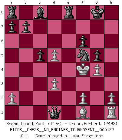 Last move : 0-1 2022 July 19 0:51:5 [Event "FICGS__CHESS__NO_ENGINES_TOURNAMENT__000122"] [Site "FICGS"] [Date "2022.07.17"] [Round "1"] [White "Brand Lyard,Paul"] [Black "Kruse,Herbert"] [Result "0-1"] [WhiteElo "1476"] [BlackElo "2493"] 1.e4 c5 2.c4 Nc6 3.d3 e6 4.Nc3 Nf6 5.Bg5 h6 6.Bxf6 Qxf6 7.Nb5 Qd8 8.Nc3 Be7 9.Nb5 d5 10.Qg4 O-O 11.cxd5 exd5 12.Qf4 Qa5+ 13.Ke2 Qxb5 14.exd5 Qxb2+ 15.Kf3 Nd4+ 16.Kg3 Qxa1 17.Nh3 Bd6 18.Qxd6 Nf5+ 19.Kg4 Nxd6 20.Kg3 Nf5+ 21.Kf3 Qd1+ 22.Ke4 Re8+ 23.Kf4 f6 24.g4 g5+ 25.Nxg5 hxg5+ 0-1 Sicilian defense Kingside Castling by player Black (move 10) Player Black won this chess game. Follow this game move after move (download)The older I grow, the more I value Pawns. (Keres) Ich würde die 30 stärksten Spieler der USA im Simultanspiel besiegen. (José Raúl Capablanca) Cuando tu no sabes absolutamente que mas hacer, es tiempo de entrar en pánico. (John van der Wiel) On a dit que l'homme se distingue de l'animal par le fait qu'il achète plus de livres qu'il ne peut en lire. Je voudrais suggérer qu'inclure à la liste des livres quelques livres d'échecs rendrait la distinction manifeste. (Edward Lasker) Just because you do not take an interest in politics doesn't mean politics won't take an interest in you. (Pericles 430 B.C.)