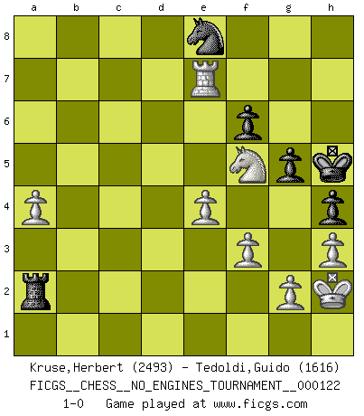 Last move : 1-0 2022 October 19 9:22:9 [Event "FICGS__CHESS__NO_ENGINES_TOURNAMENT__000122"] [Site "FICGS"] [Date "2022.07.17"] [Round "1"] [White "Kruse,Herbert"] [Black "Tedoldi,Guido"] [Result "1-0"] [WhiteElo "2493"] [BlackElo "1616"] 1.e4 c5 2.Nf3 Nc6 3.d4 cxd4 4.Nxd4 e5 5.Nb5 d6 6.c4 a6 7.N5c3 Nf6 8.Be2 h6 9.O-O Be7 10.Be3 Be6 11.Nd2 O-O 12.Nd5 Nd4 13.Nxe7+ Qxe7 14.Bxd4 exd4 15.f3 Rac8 16.Rc1 Bd7 17.Nb3 Qe5 18.Qxd4 Qxd4+ 19.Nxd4 Rfe8 20.Rfd1 h5 21.Nc2 Re6 22.Ne3 g6 23.Rc2 b5 24.cxb5 Rxc2 25.Nxc2 Bxb5 26.Bxb5 axb5 27.Nd4 Re5 28.Nc6 Rc5 29.Rxd6 Rc1+ 30.Kf2 Rc2+ 31.Kf1 Ne8 32.Rd8 Kf8 33.Nd4 Rxb2 34.a3 f6 35.Rb8 g5 36.Rxb5 Ra2 37.Ra5 h4 38.h3 Kf7 39.Ra7+ Kg6 40.Nf5 Ra1+ 41.Kf2 Ra2+ 42.Kg1 Ra1+ 43.Kh2 Ra2 44.a4 Kh5 45.Re7 1-0 Sicilian : Labourdonnais-Loewenthal (Kalashnikov) variation Kingside Castling by player White (move 9) Kingside Castling by player Black (move 11) Player White won this chess game. Follow this game move after move (download)War is the child of passion, passion is the child of narcissism and narcissism is the child. (...) Another game ? (Thibault de Vassal) Ich habe die besten Aussichten, den ersten Preis zu gewinnen - denn jeder muss gegen Steinitz spielen, nur ich nicht! (Wilhelm Steinitz) Debemos de asegurarnos de que el Ajedrez no se convierta en un lenguaje muerto, muy interesante, pero solo para un grupo muy pequeño. (Sytze Faber) L'attaque fait le spectacle, la défense gagne les matchs. (Dicton footballistique) Nobody is always a winner, and anybody who says he is, is either a liar or doesn't play poker. (Amarillo Slim)