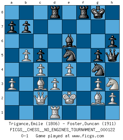 Last move : 0-1 2022 October 31 8:29:19 [Event "FICGS__CHESS__NO_ENGINES_TOURNAMENT__000122"] [Site "FICGS"] [Date "2022.07.17"] [Round "1"] [White "Trigance,Emile"] [Black "Foster,Duncan"] [Result "0-1"] [WhiteElo "1806"] [BlackElo "1911"] 1.a3 f5 2.b4 Nf6 3.Bb2 e6 4.c4 g6 5.g3 c5 6.b5 d5 7.Qc2 d4 8.d3 Bg7 9.Bg2 O-O 10.Bc1 Nbd7 11.Nh3 h6 12.Nf4 Qe8 13.Bb2 g5 14.Nh3 e5 15.f3 e4 16.dxe4 fxe4 17.fxe4 Ng4 18.Bc1 d3 19.exd3 Bxa1 20.Nc3 Nde5 21.Bd2 Be6 22.Ke2 Bxc3 23.Bxc3 Rd8 24.Rd1 Qh5 0-1 Anderssen's Opening Kingside Castling by player Black (move 9) Player Black won this chess game. Follow this game move after move (download)When I have White, I win because I am white; When I have Black, I win because I am Bogolyubov. (Bogolyubov) Der Traum, für den ich lebe, ist der von einem freien Russland. Viele mögen sagen: Russland hat doch ein Parlament, einen gewählten Präsidenten. Aber ich spüre, dass in meiner Heimat die Angst wiederkehrt. Eine Angst, sich frei zu äußern, bestimmte Dinge zu tun (Garry Kasparov) Los Peones son el alma de una partida de Ajedrez. (Francois Andre Danican Philidor) C'est la seule position que je connaisse où les deux camps sont mals. Propos prêtés à V. Anand. Success without honor is an unseasoned dish; it will satisfy your hunger, but it won't taste good. (Joe Paterno)
