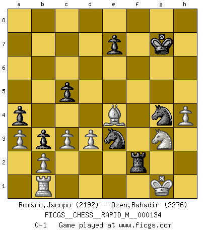Last move : 0-1 2022 September 19 13:0:5 [Event "FICGS__CHESS__RAPID_M__000134"] [Site "FICGS"] [Date "2022.07.17"] [Round "1"] [White "Romano,Jacopo"] [Black "Ozen,Bahadir"] [Result "0-1"] [WhiteElo "2192"] [BlackElo "2276"] 1.e4 c5 2.Nc3 d6 3.g3 Nc6 4.Bg2 g6 5.d3 Bg7 6.Be3 Rb8 7.Qd2 b5 8.Nge2 b4 9.Nd1 Nd4 10.O-O h5 11.Bg5 a5 12.a3 b3 13.c3 Nc2 14.Rc1 Nh6 15.h3 f6 16.Be3 Nf7 17.f4 Bh6 18.Kh2 g5 19.Rb1 a4 20.fxg5 fxg5 21.e5 Qd7 22.exd6 Qxd6 23.Nf2 Bf5 24.Ne4 Bxe4 25.Bxe4 h4 26.Kg2 g4 27.Bxh6 Qxh6 28.Qf4 Ne3+ 29.Kg1 O-O 30.Qxh6 Nxh6 31.Rxf8+ Rxf8 32.hxg4 Nhxg4 33.gxh4 Rf2 34.Ng3 Kg7 0-1 Sicilian : Closed Kingside Castling by player White (move 10) Kingside Castling by player Black (move 29) Player Black won this chess game. Follow this game move after move (download)Chess is a beautiful mistress. (Bent Larsen) Immer nach dem besten Zug zu suchen ist ziemlich unpraktisch. (Nigel Short) El Ajedrez es parte de una cultura y si una cultura esta en decadencia, entonces también el Ajedrez declinará. (Mikhail Botvinnik) Karpov est une pièce de musée. (Garry Kasparov) If you work for a living, why do you kill yourself working ? (Tuco to a chicken in The Good, The Bad and The Ugly)