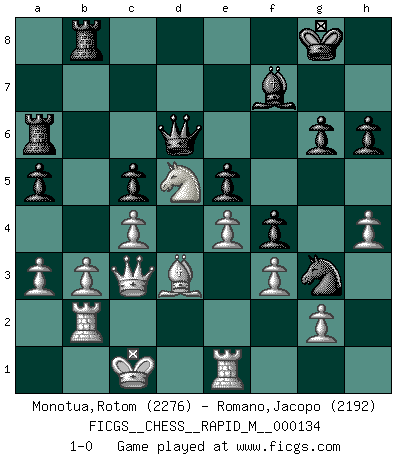 Last move : 1-0 2022 September 3 16:33:3 [Event "FICGS__CHESS__RAPID_M__000134"] [Site "FICGS"] [Date "2022.07.17"] [Round "1"] [White "Monotua,Rotom"] [Black "Romano,Jacopo"] [Result "1-0"] [WhiteElo "2276"] [BlackElo "2192"] 1.d4 Nf6 2.c4 g6 3.h4 Bg7 4.Nc3 d6 5.e4 Nc6 6.Nge2 O-O 7.f3 e5 8.d5 Nd4 9.Be3 c5 10.dxc6 bxc6 11.Nxd4 exd4 12.Bxd4 c5 13.Bf2 Nh5 14.Bd3 Rb8 15.Qd2 Be5 16.b3 Re8 17.Be3 f5 18.O-O-O f4 19.Bf2 Be6 20.Be1 Rb4 21.Kc2 Qa5 22.Rb1 Reb8 23.Kd1 Qb6 24.Qc1 Qb7 25.Bd2 Qf7 26.Ne2 R4b6 27.Bc3 Qe7 28.Bxe5 dxe5 29.Nc3 Ng3 30.Re1 a5 31.Nd5 Qd6 32.Qc3 Ra6 33.a3 Bf7 34.Kc1 h6 35.Rb2 1-0 King's Indian defense Kingside Castling by player Black (move 6) Queenside Castling by player White (move 18) Player White won this chess game. Follow this game move after move (download)I like the moment when I break a man's ego. (Bobby Fischer) Der Partner hat auch seine Existenzberechtigung. (Savielly Grigorievitsch Tartakower) Las Aperturas te enseñan aperturas. ¡Los Finales te enseñan Ajedrez!. (Stephan Gerzadowicz) Je menace de comprendre la position. (Anonyme) Life is the sum of all your choices. (Albert Camus)