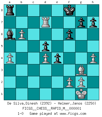 Last move : 1-0 2006 September 22 8:16:33 [Event "FICGS__CHESS__RAPID_M__000001"] [Site "FICGS"] [Date "2006.04.10"] [Round "1"] [White "De Silva,Dinesh"] [Black "Helmer,Janos"] [Result "1-0"] [WhiteElo "2392"] [BlackElo "2250"] 1.e4 Nf6 2.e5 Nd5 3.d4 d6 4.Nf3 Bg4 5.Be2 e6 6.O-O Be7 7.c4 Nb6 8.Nc3 O-O 9.Be3 N8d7 10.exd6 cxd6 11.b3 Nf6 12.a4 d5 13.c5 Nbd7 14.b4 Rc8 15.h3 Bh5 16.Bf4 Ne4 17.Nxe4 dxe4 18.Nd2 Bg6 19.Nc4 Nf6 20.Nd6 Rb8 21.Bc4 Qd7 22.Be5 a6 23.Qe2 Ra8 24.b5 a5 25.Rfe1 Rfd8 26.Qa2 Bxd6 27.Bxd6 Ne8 28.Be5 Nc7 29.Rac1 Rdc8 30.Qb3 Nd5 31.Bxd5 exd5 32.Bd6 Qe6 33.Qg3 Re8 34.c6 bxc6 35.b6 Qc8 36.Qc3 Bf5 37.Qxc6 Qxc6 38.Rxc6 Bc8 39.Rec1 Ba6 40.R1c5 Red8 41.Rxa5 f6 42.Bg3 Bb7 43.Rxa8 Rxa8 44.Rc7 Ba6 45.Rd7 Kf8 46.h4 1-0 Alekhine's defense : Modern variation, 4...Bg4 Kingside Castling by player White (move 6) Kingside Castling by player Black (move 8) Player White won this chess game. Follow this game move after move (download)You cannot play at Chess if you are kind-hearted. (French Proverb) Ich war schon mal beim Dopingtest. Da musste ich Urin abgeben, während Dritte zusahen. (Elisabeth Pähtz) Creo que una cierta cantidad de temperamento es esperada de los genios del Ajedrez. (Ron Gross) Vous m'avez demandé de vous exposer quel est le fondement de la prière. Je ne fais que préparer les pièces du jeu sur la table... Nous sera-t-il permis d'en adopter les règles et si nous les appliquons scrupuleusement nous ne tarderons pas à faire mat le Roi divin ! Il ne pourra échapper à nos mains. (Sainte Thérèse d'Avila, Chemin de perfection) Statistics can be made to prove anything - even the truth. (Author unknown)