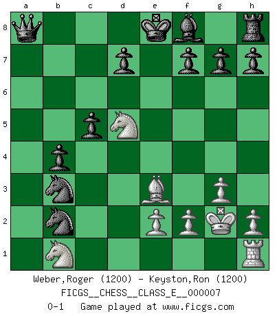 Last move : 0-1 2006 September 9 20:51:52 [Event "FICGS__CHESS__CLASS_E__000007"] [Site "FICGS"] [Date "2006.06.27"] [Round "1"] [White "Weber,Roger"] [Black "Keyston,Ron"] [Result "0-1"] [WhiteElo "1200"] [BlackElo "1200"] 1.d4 Nf6 2.c4 c5 3.d5 b5 4.cxb5 a6 5.Qa4 Nxd5 6.g3 Bb7 7.Bg2 Nb6 8.Bxb7 Nxa4 9.Bxa8 axb5 10.Bf3 Nc6 11.Be3 Nb4 12.Na3 Qa5 13.Kf1 Nxb2 14.Nb1 Nc2 15.Bd2 b4 16.Nh3 Nxa1 17.Kg2 Qxa2 18.Nf4 Nb3 19.Bd5 e6 20.Be3 exd5 21.Nxd5 Qa8 0-1 Benko gambit half accepted Player Black won this chess game. Follow this game move after move (download)First-class players lose to second class players because second-class players sometimes play a first-class game. (Tarrasch) Wenn man heute mit 14 Jahren noch kein GM ist, kann man es vergessen. (Viswanathan Anand) No existe un remordimiento como el remordimiento del Ajedrez. (H. G. Wells) Les ravages du H expliquent la différence de niveau entre Tal et Thal [Abergel]. Tomorrow's what you make of it. (Horatio Caine, C.S.I. Miami)