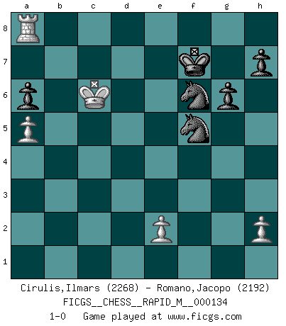 Last move : 1-0 2022 September 3 16:32:49 [Event "FICGS__CHESS__RAPID_M__000134"] [Site "FICGS"] [Date "2022.07.17"] [Round "1"] [White "Cirulis,Ilmars"] [Black "Romano,Jacopo"] [Result "1-0"] [WhiteElo "2268"] [BlackElo "2192"] 1.d4 f5 2.g3 Nf6 3.Bg2 g6 4.Nf3 Bg7 5.O-O O-O 6.c4 d6 7.Nc3 c6 8.Qc2 Na6 9.Rb1 Qe8 10.b4 Nc7 11.b5 cxb5 12.cxb5 Bd7 13.a4 Rc8 14.Qd3 e5 15.dxe5 dxe5 16.Nxe5 Qxe5 17.Bf4 Qe8 18.Bxb7 Ne6 19.Bxc8 Bxc8 20.Bd6 Rf7 21.b6 a6 22.Qc4 Bb7 23.Rfd1 Ng4 24.Nd5 Ng5 25.Ne7+ Kh8 26.Qc7 Nh3+ 27.Kf1 f4 28.Qxb7 fxg3 29.Bxg3 Ne3+ 30.Ke1 Bc3+ 31.Rd2 Bxd2+ 32.Kxd2 Qd8+ 33.Kc3 Rxe7 34.Qb8 Qxb8 35.Bxb8 Nxf2 36.Be5+ Rxe5 37.b7 Re8 38.b8Q Rxb8 39.Rxb8+ Kg7 40.a5 Kf6 41.Re8 Nfg4 42.Kd4 Nf5+ 43.Kd5 Kf7 44.Ra8 Nf6+ 45.Kc6 1-0 Follow this game move after move (download)Chess is a terrible game. If you have no center, your opponent has a freer position. If you do have a center, then you really have something to worry about ! (Siegbert Tarrasch) Wie kann ich Remis annehmen? Ich weiß ja gar nicht, wie ich stehe! (Fritz Sämisch) No soy una persona materialista y por eso, no resiento la falta o pérdida del dinero. La ausencia de cosas mundanas carece de importancia. Ya que el Ajedrez es una forma en la que puedo ser tan materialista como yo desee sin tener la necesidad de vender mi alma. (Jamie Walter Adams) Le joueur d'Echecs qui veut atteindre le top est obligé de développer son propre credo créatif. Alexeï Stepanovicth Souétine. Il est facile d'écrire des livres ! Ce qui est difficile, c'est de jouer ! (Alexeï Stepanovicth Souétine) It's not the size of the dog in the fight, it's the size of the fight in the dog. (Mark Twain)