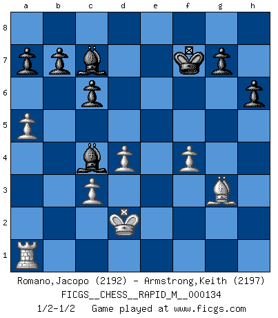 Last move : 1/2-1/2 2022 September 14 2:28:40 [Event "FICGS__CHESS__RAPID_M__000134"] [Site "FICGS"] [Date "2022.07.17"] [Round "1"] [White "Romano,Jacopo"] [Black "Armstrong,Keith"] [Result "1/2-1/2"] [WhiteElo "2192"] [BlackElo "2197"] 1.e4 e5 2.Nf3 Nc6 3.Bc4 Bc5 4.c3 Nf6 5.d4 exd4 6.e5 d5 7.Bb5 Ne4 8.cxd4 Bb6 9.Nc3 O-O 10.Be3 Bg4 11.h3 Bh5 12.Qc2 Nxc3 13.bxc3 f6 14.exf6 Qxf6 15.Be2 Bg6 16.Qb3 Qe6 17.O-O Na5 18.Qb4 Nc4 19.Bxc4 Rxf3 20.gxf3 dxc4 21.Rfe1 Rf8 22.Bd2 Qxh3 23.Qxc4+ Bf7 24.Qf1 Qxf3 25.Qg2 Qxg2+ 26.Kxg2 Bd5+ 27.Kf1 Rf5 28.a4 Kf7 29.Re3 Rh5 30.Rae1 Rh1+ 31.Ke2 Rxe1+ 32.Bxe1 Bc4+ 33.Kd2 c6 34.Rf3+ Ke8 35.Rh3 h6 36.f4 Bc7 37.Bg3 Be6 38.Rh5 Bb3 39.a5 Bc4 40.Rh1 Kf7 41.Ra1 1/2-1/2 Follow this game move after move (download)The only thing Chess players have in common is Chess. (Lodewijk Prins) Je mehr wir mit Computern analysieren, desto mehr glauben wir an Verteidigung. (Vladimir Kramnik) Bobby Fischer es el mas grande genio de Ajedrez de todos los tiempos. (Alexander Kotov) Les Echecs mettent en conflit, non pas deux intelligences, mais deux volontés. (Lasker) Memory is a complicated thing, a relative to truth, but not its twin. (Barbara Kingsolver, Animal Dreams)