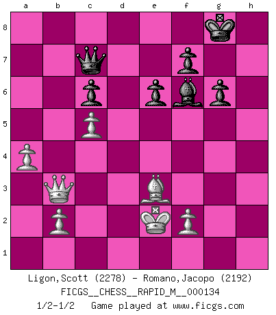 Last move : 1/2-1/2 2022 September 1 20:36:15 [Event "FICGS__CHESS__RAPID_M__000134"] [Site "FICGS"] [Date "2022.07.17"] [Round "1"] [White "Ligon,Scott"] [Black "Romano,Jacopo"] [Result "1/2-1/2"] [WhiteElo "2278"] [BlackElo "2192"] 1.e4 c5 2.c3 d5 3.exd5 Qxd5 4.d4 Nf6 5.Nf3 e6 6.Na3 Nc6 7.Be3 cxd4 8.Nb5 Qd8 9.Nbxd4 Nd5 10.Nxc6 bxc6 11.Bd2 Be7 12.c4 Nb4 13.Qa4 Bd7 14.c5 a5 15.Rc1 Bf6 16.a3 Nd5 17.Rc2 Qc7 18.Bd3 O-O 19.O-O Rfb8 20.Bc1 Bc8 21.Qe4 g6 22.Re1 Bg7 23.Qh4 Ba6 24.Bxa6 Rxa6 25.Ng5 h6 26.Ne4 Qe7 27.Qh3 h5 28.Qd3 R6a8 29.Nd6 a4 30.h3 Rb3 31.Qd2 Qa7 32.Rc4 Qa5 33.Qe2 Rf8 34.Rd1 Qa7 35.Rd3 Rfb8 36.Rxb3 axb3 37.g3 Qc7 38.h4 Qa7 39.g4 Nf6 40.gxh5 Nxh5 41.Qe4 Qd7 42.Rb4 Rxb4 43.Qxb4 Qa7 44.Ne4 Nf6 45.Qb6 Qa8 46.Nxf6+ Bxf6 47.Qxb3 Qd8 48.a4 Bxh4 49.Kf1 Bf6 50.Ke2 Qc7 51.Be3 1/2-1/2 Follow this game move after move (download)Life is like a game of Chess, changing with each move. (Chinese proverb) Wenn ich Weiß habe gewinne ich weil ich Weiß habe, wenn ich Schwarz habe gewinne ich weil ich Bogoljubov bin. (Efim Bogoljubov) Fischer es una tragedia del Ajedrez Americano a la par con Morphy y Pillsbury. (Mig Greengard) Même si vous avez un bon coup à faire, regardez toujours s'il n'y en a pas un qui lui soit préférable. (Pedro Damiano) The modern world has divided itself into Conservatives and Progressives. The business of Progressives is to go on making mistakes. The business of the Conservatives is to prevent the mistakes from being corrected. (G.K. Chesterton)