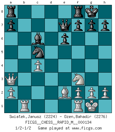 Last move : 1/2-1/2 2022 August 17 11:48:11 [Event "FICGS__CHESS__RAPID_M__000134"] [Site "FICGS"] [Date "2022.07.17"] [Round "1"] [White "Swiatek,Janusz"] [Black "Ozen,Bahadir"] [Result "1/2-1/2"] [WhiteElo "2224"] [BlackElo "2276"] 1.d4 d5 2.c4 e6 3.Nf3 Nf6 4.Nc3 c6 5.e3 Nbd7 6.Bd3 dxc4 7.Bxc4 b5 8.Be2 Bb7 9.O-O Be7 10.e4 b4 11.e5 bxc3 12.exf6 Bxf6 13.bxc3 c5 14.dxc5 O-O 15.Ba3 Be7 16.Rb1 Bd5 17.Qc1 Bxc5 18.c4 Bc6 19.Bxc5 Nxc5 20.Qa3 Qe7 1/2-1/2 Follow this game move after move (download)Chess is a beautiful mistress. (Bent Larsen) Strategie ist, wie man ein Mädchen auf den Rücksitz bekommt. Taktik ist, was man tut, wenn man dann dort ist. (Anonymous) Un buen jugador siempre tiene buena suerte. (José Raúl Capablanca) Il a essayé de se convaincre qu'il pourrait empêcher toutes les erreurs et ne jamais perdre. L'horreur ! Gary Kasparov au sujet de Robert Fischer. I take risks, sometimes patients die, but not taking risks causes more patients to die. So I guess my biggest problem is I've been cursed with the ability to do the math. (Gregory House, House M.D.)