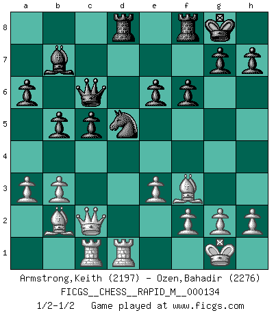 Last move : 1/2-1/2 2022 August 27 7:7:47 [Event "FICGS__CHESS__RAPID_M__000134"] [Site "FICGS"] [Date "2022.07.17"] [Round "1"] [White "Armstrong,Keith"] [Black "Ozen,Bahadir"] [Result "1/2-1/2"] [WhiteElo "2197"] [BlackElo "2276"] 1.d4 Nf6 2.Nf3 d5 3.c4 dxc4 4.e3 e6 5.Bxc4 c5 6.O-O a6 7.b3 Nbd7 8.Bb2 Be7 9.Nbd2 O-O 10.Be2 b6 11.Ne5 Nxe5 12.dxe5 Nd5 13.Nc4 Bb7 14.Rc1 Qc7 15.a3 Rad8 16.Qc2 b5 17.Nd6 Bxd6 18.exd6 Qxd6 19.Rfd1 Qc6 20.Bf3 f6 1/2-1/2 Follow this game move after move (download)If Chess is a science, it's a most inexact one. If Chess is an art, it is too exacting to be seen as one. If Chess is a sport, it's too esoteric. If Chess is a game, it's too demanding to be just a game. If Chess is a mistress, she's a demanding one. If Chess is a passion, it's a rewarding one. If Chess is life, it's a sad one. (Unknown) Der Vorposten provoziert a) eine Basis für neue Angriffe und b) eine Schwächung der gegnerischen Widerstandskraft in der fraglichen Linie. (Aaron Nimzowitsch) Todos los jugadores de Ajedrez deberían tener un pasatiempo. (Savielly Tartakower) Les réformistes prétendent que les progrès de la théorie conduiront à la disparition des échecs, et qu'il faut, pour leur rendre vie, en remanier les règles. En réalité, qu'exprime cette affirmation? Le mépris de l'intuition, de l'imagination et de tous les autres éléments qui font des échecs un art. (Alexander Alekhine) Heh, heh, heh. Time to abandon ship. (General Grievous in Star Wars ep.3)