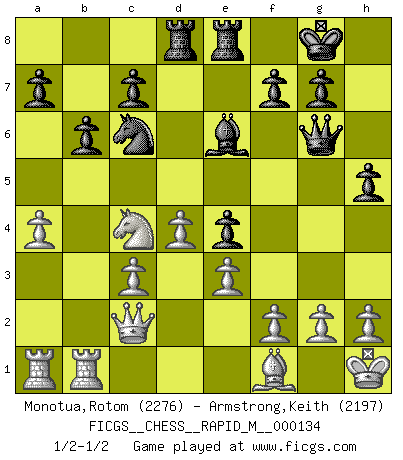 Last move : 1/2-1/2 2022 August 27 5:9:12 [Event "FICGS__CHESS__RAPID_M__000134"] [Site "FICGS"] [Date "2022.07.17"] [Round "1"] [White "Monotua,Rotom"] [Black "Armstrong,Keith"] [Result "1/2-1/2"] [WhiteElo "2276"] [BlackElo "2197"] 1.d4 Nf6 2.c4 e6 3.Nf3 d5 4.Nc3 Bb4 5.Bg5 h6 6.Qa4+ Nc6 7.Bxf6 Qxf6 8.e3 O-O 9.Be2 dxc4 10.O-O Bd7 11.Bxc4 Bxc3 12.bxc3 Rfd8 13.Be2 b6 14.Bb5 e5 15.Rfd1 e4 16.Nd2 Qg6 17.Bf1 Re8 18.Qc2 h5 19.Kh1 Rad8 20.Nc4 Qf6 21.a4 Bg4 22.Rdb1 Be6 23.Kg1 Qg6 24.Kh1 1/2-1/2 Follow this game move after move (download)I play correspondence chess because it is both art and science while chess is art only. (A player at FICGS) Es hat in meinem Leben Zeiten gegeben, da ich sehr nahe daran war zu glauben, daß ich auch nicht eine einzige Schachpartie verlieren könnte. (José Raúl Capablanca) Los libros de Ajedrez deben de usarse igual como usamos los anteojos: para mejorar la vista, aunque algunos jugadores los quieren usar como si ellos les otorgaran la vision. (José Raúl Capablanca) Ce qui est bien, c'est d'avoir tout un tas de pièces en prise : l'adversaire ne peut en prendre qu'une à la fois. Cité par Thierry Audin. I don't diet. I just don't eat as much as I'd like to. (Linda Evangelista, supermodel)