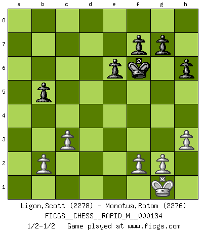 Last move : 1/2-1/2 2022 August 4 14:35:6 [Event "FICGS__CHESS__RAPID_M__000134"] [Site "FICGS"] [Date "2022.07.17"] [Round "1"] [White "Ligon,Scott"] [Black "Monotua,Rotom"] [Result "1/2-1/2"] [WhiteElo "2278"] [BlackElo "2276"] 1.e4 c5 2.c3 Nf6 3.e5 Nd5 4.Bc4 e6 5.d4 d6 6.Nf3 Nc6 7.O-O Be7 8.exd6 Qxd6 9.dxc5 Qxc5 10.Qe2 O-O 11.Rd1 Qa5 12.Nbd2 Rd8 13.Nb3 Qc7 14.h3 Nf6 15.Rxd8+ Bxd8 16.Bg5 b6 17.Rd1 Bb7 18.Nbd4 Nxd4 19.Rxd4 Be7 20.Bf4 Qc6 21.Bb5 Qc5 22.Qd3 a6 23.Ba4 b5 24.Bc2 Qc6 25.Be5 Kf8 26.Qd2 h6 27.Ne1 Qb6 28.Qf4 Bd5 29.Nd3 Rc8 30.Bb3 Qc6 31.Bxd5 Nxd5 32.Qg4 Nf6 33.Qd1 Qb6 34.a4 Rd8 35.Qe2 Nd7 36.axb5 Nxe5 37.Rxd8+ Bxd8 38.Qxe5 Bf6 39.Qc5+ Qxc5 40.Nxc5 axb5 41.Nd7+ Ke7 42.Nxf6 Kxf6 1/2-1/2 Follow this game move after move (download)Chess books should be used as we use glasses: to assist the sight, although some players make use of them as if they thought they conferred sight. (Jose Raul Capablanca) Schach ist Leben. (Robert James Fischer) Bobby solo arroja las piezas y solas caen en las casillas correctas. (Miguel Najdorf ) Les Echecs sont et restent toujours un combat, un combat intégral comme la boxe, la lutte ou un autre sport, et où il doit y avoir un vainqueur et un vaincu. (Joseph Emil Diemer) Think like a man of action, act like a man of thought. (Henri Louis Bergson)