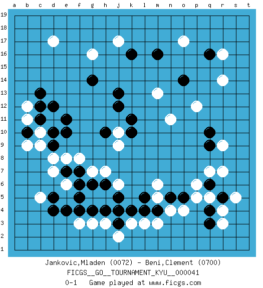 Last move : 0-1 2007 November 2 19:10:28 [Event "FICGS__GO__TOURNAMENT_KYU__000041"] [Site "FICGS"] [Date "2007.08.03"] [Round "1"] [Black "Jankovic,Mladen"] [White "Beni,Clement"] [Result "0-1"] [Rating 1 "0072"] [Rating 2 "0700"] 1.d4 d17 2.d10 j17 3.k11 r16 4.q10 k3 5.q4 r3 6.q3 r4 7.r5 s5 8.k4 q5 9.q16 r14 10.g14 c10 11.c11 d11 12.b10 c9 13.d9 b11 14.c12 b9 15.e11 o17 16.k16 r7 17.q6 p5 18.o5 p6 19.d12 b12 20.c13 o4 21.n5 r9 22.q9 n4 23.m4 m3 24.l4 l3 25.j3 m5 26.l5 m6 27.m16 h3 28.j4 j2 29.h4 g3 30.g4 f3 31.f4 q7 32.e4 c5 33.d5 d8 34.e10 h7 35.g6 g7 36.h6 e8 37.f6 j10 38.k10 n11 39.o14 m13 40.j13 g16 41.h10 j9 42.j12 p12 43.f5 j6 44.j5 e6 45.e7 d7 46.f7 f8 0-1 Here are the names of the openings (joseki) played in the four corners : Corner q4 : q4 r3 Hoshi (Hwajeom, Seongjeom, Xingwei`) 4-4 Point. The star or hoshi (4-4) point, emphasizing influence at the potential expense of territory. Corner q16 : r16 q16 Komoku (Somok, Xiao~mu`) 3-4 Point. The komoku (3-4) point is the traditional corner enclosure move.. Corner d4 : d4 c9 Hoshi (Hwajeom, Seongjeom, Xingwei`) 4-4 Point. The star or hoshi (4-4) point, emphasizing influence at the potential expense of territory. Player White won this Go (weiqi, baduk) game. Follow this game move after move (download)Studying go is a wonderful way to develop both the creative as well as the logical abilities of children because to play it both sides of the brain are necessary. (Cho Chikun) Computers make it easier to do a lot of things, but most of the things they make it easier to do don't need to be done. (Andy Rooney)