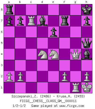 Last move : 1/2-1/2 2022 August 19 10:49:12 [Event "FICGS__CHESS__CLASS_GM__000011"] [Site "FICGS"] [Date "2022.07.17"] [Round "1"] [White "Szczepanski,Zbigniew"] [Black "Kruse,Herbert"] [Result "1/2-1/2"] [WhiteElo "2486"] [BlackElo "2493"] 1.d4 Nf6 2.c4 e6 3.Nc3 Bb4 4.Qc2 O-O 5.e4 d5 6.e5 Ne4 7.Bd3 c5 8.Nf3 cxd4 9.Nxd4 Nd7 10.Bf4 Qh4 11.g3 Qh5 12.O-O g5 13.cxd5 gxf4 14.dxe6 Nxe5 15.Nxe4 fxe6 16.gxf4 Rxf4 17.Kh1 Kh8 18.Rg1 Nxd3 19.Qxd3 Be7 20.Rac1 Bd7 21.Qg3 Rf7 22.Rc7 Bh4 23.Qg4 1/2-1/2 Follow this game move after move (download)For surely of all the drugs in the world, Chess must be the most permanently pleasurable. (Assiac) Die westlichen Werte sind eine Sprache, welche die Putin-Administration nicht versteht. (Garry Kasparov) Sin errores no puede haber brillantez. (Emanuel Lasker) Les erreurs sont comme les malheurs, elles n'arrivent jamais seules. (Siegbert Tarrasch) When you don't know what to do, walk fast and look worried. (Anonymous)
