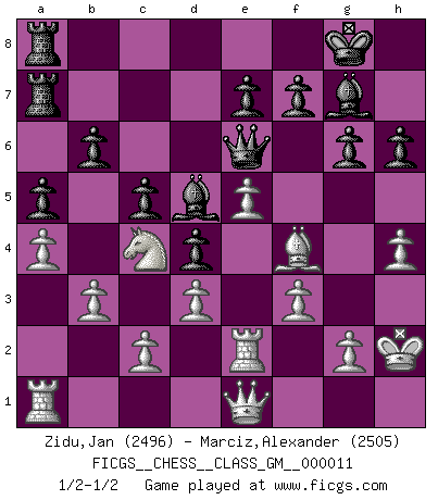 Last move : 1/2-1/2 2022 October 11 10:16:52 [Event "FICGS__CHESS__CLASS_GM__000011"] [Site "FICGS"] [Date "2022.07.17"] [Round "1"] [White "Zidu,Jan"] [Black "Marciz,Alexander"] [Result "1/2-1/2"] [WhiteElo "2496"] [BlackElo "2505"] 1.e4 c5 2.Nf3 Nc6 3.Bb5 g6 4.O-O Bg7 5.Re1 Nf6 6.e5 Nd5 7.Nc3 Nc7 8.Bxc6 dxc6 9.Ne4 b6 10.d3 O-O 11.h3 Ne6 12.a4 a5 13.Neg5 Nd4 14.Bf4 h6 15.Ne4 Ra7 16.b3 Be6 17.Nxd4 cxd4 18.h4 c5 19.Nd2 Qd7 20.Nc4 Qc6 21.Re2 Bd5 22.f3 Qe6 23.Qe1 Rfa8 24.Kh2 1/2-1/2 Follow this game move after move (download)If one piece is badly posted, the whole game is bad. (Tarrasch) Vielleicht wirkt die Aura früherer Spieler glanzvoller als die der heutigen Spieler, aber das liegt daran, dass man kein Programm wie Fritz hatte, das einem all die Löcher in ihren Partien zeigt. (Vladimir Kramnik) Uno por uno, yo los acribillé, mi superioridad muy pronto se volvio aparente. (Jose Capablanca) 'L'échange des dames est un coup dur pour les deux adversaires...' Un journaliste lors d'une partie du match Spassky-Fischer If passion drives you, let reason holds the reins. (Benjamin Franklin)