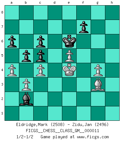 Last move : 1/2-1/2 2022 November 8 19:10:37 [Event "FICGS__CHESS__CLASS_GM__000011"] [Site "FICGS"] [Date "2022.07.17"] [Round "1"] [White "Eldridge,Mark"] [Black "Zidu,Jan"] [Result "1/2-1/2"] [WhiteElo "2508"] [BlackElo "2496"] 1.e4 e5 2.Nf3 Nc6 3.Bb5 Nf6 4.O-O Nxe4 5.d4 Nd6 6.Bxc6 dxc6 7.dxe5 Nf5 8.Qxd8+ Kxd8 9.h3 Bd7 10.Rd1 Be7 11.g4 Nh4 12.Nxh4 Bxh4 13.Nd2 Ke8 14.Ne4 Rd8 15.Bf4 h5 16.f3 Ke7 17.b3 b6 18.Rd3 c5 19.Rad1 hxg4 20.hxg4 Bb5 21.c4 Rxd3 22.Rxd3 Bc6 23.Nc3 g5 24.Bd2 Rd8 25.Nd5+ Bxd5 26.Rxd5 c6 27.Rxd8 Kxd8 28.Kf1 Ke7 29.Ke2 Ke6 30.f4 gxf4 31.Bxf4 a6 32.a4 b5 33.Kd3 Bf2 34.Ke4 Bd4 35.Bg3 Bb2 1/2-1/2 Follow this game move after move (download)All my games are real. (Bobby Fischer) Ich liebe den Moment, wenn ich das Ego meines Gegenüber breche. (Robert James Fischer) Si no le temes a Spassky, entonces elimino el elemento del dinero. (Jim Slater) Les échecs, c'est l'imagination. (David Bronstein) Memory is a crazy woman that hoards colored rags and throws away food. (Austin O'Malley)