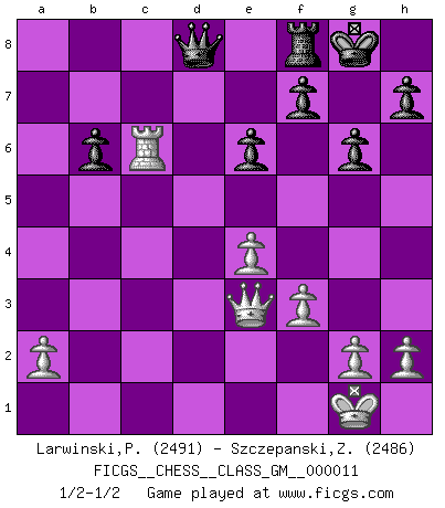 Last move : 1/2-1/2 2022 August 11 10:19:8 [Event "FICGS__CHESS__CLASS_GM__000011"] [Site "FICGS"] [Date "2022.07.17"] [Round "1"] [White "Larwinski,Paul"] [Black "Szczepanski,Zbigniew"] [Result "1/2-1/2"] [WhiteElo "2491"] [BlackElo "2486"] 1.d4 Nf6 2.c4 g6 3.Nc3 d5 4.cxd5 Nxd5 5.e4 Nxc3 6.bxc3 Bg7 7.Bc4 c5 8.Ne2 O-O 9.O-O Nc6 10.Be3 b6 11.Rc1 e6 12.Qd2 cxd4 13.cxd4 Bb7 14.Bb5 Rc8 15.Rfd1 Na5 16.f3 Rxc1 17.Rxc1 a6 18.Bd3 Nc6 19.Bxa6 Bxa6 20.Rxc6 Bxe2 21.Qxe2 Bxd4 22.Qd2 Bxe3+ 23.Qxe3 1/2-1/2 Follow this game move after move (download)A good player is always lucky. (Jose Raul Capablanca) Modernes Schach erfordert enorme Anspannung. Es ist für einen normalen Menschen unmöglich das auszuhalten. (Viktor Kortschnoi) No es suficiente ser un buen jugador, se debe también de jugar bién. (Siegbert Tarrasch) Toute estimation doit être constamment réévaluée. (Jacob Estrin) If we don't succeed, we run the risk of failure. (George W. Bush)