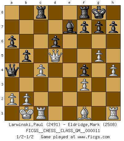 Last move : 1/2-1/2 2022 August 21 20:4:19 [Event "FICGS__CHESS__CLASS_GM__000011"] [Site "FICGS"] [Date "2022.07.17"] [Round "1"] [White "Larwinski,Paul"] [Black "Eldridge,Mark"] [Result "1/2-1/2"] [WhiteElo "2491"] [BlackElo "2508"] 1.e4 c5 2.Nf3 d6 3.d4 cxd4 4.Nxd4 Nf6 5.Nc3 a6 6.f3 e5 7.Nb3 Be6 8.Be3 Be7 9.Qd2 O-O 10.O-O-O Nbd7 11.g4 b5 12.g5 Nh5 13.Kb1 Nb6 14.Na5 Rc8 15.Nd5 Nxd5 16.exd5 Bxd5 17.Qxd5 Qxa5 18.c4 Nf4 19.Bxf4 exf4 20.h4 Qa4 21.Rc1 1/2-1/2 Follow this game move after move (download)As one by one I mowed them down, my superiority soon became apparent. (Jose Capablanca) Frage des Reporters: -Worin besteht das Ziel von Gambiteröffnungen? Antwort: -Auf Kosten der Partie einen Ruf als Angriffspieler zu erwerben.- (Siegbert Tarrasch) Prefiero perder una partida realmente buena, que ganar una mala. (David Levy) Votre prénom est 'Tactique', votre deuxième prénom est 'Tactique' et votre nom est 'Tactique'. (Ken Smith) God, you are such an idiot. - Actually, I thought I was more of a jerk. (Gregory House to Stacy Warner, House M.D.)