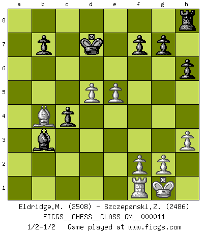 Last move : 1/2-1/2 2022 August 29 23:2:45 [Event "FICGS__CHESS__CLASS_GM__000011"] [Site "FICGS"] [Date "2022.07.17"] [Round "1"] [White "Eldridge,Mark"] [Black "Szczepanski,Zbigniew"] [Result "1/2-1/2"] [WhiteElo "2508"] [BlackElo "2486"] 1.e4 e5 2.Nf3 Nc6 3.Bb5 Nf6 4.O-O Nxe4 5.d4 Nd6 6.Bxc6 dxc6 7.dxe5 Nf5 8.Qxd8+ Kxd8 9.Nc3 Bd7 10.h3 h6 11.b3 c5 12.Nd5 a5 13.a4 Nd4 14.Nxd4 cxd4 15.Bb2 c5 16.c3 Be6 17.Nf4 Bxb3 18.cxd4 c4 19.Nd5 Bb4 20.Bc3 Kd7 21.Nxb4 axb4 22.Bxb4 Rxa4 23.Rxa4 Bxa4 24.d5 Bb3 1/2-1/2 Follow this game move after move (download)Chess is so inspiring that I do not believe a good player is capable of having an evil thought during the game. (Wilhelm Steinitz) Der Knackpunkt bei der Konzentration ist, daß wir nur durch sie etwas Neues und Ungewöhnliches am Schachbrett finden können. Sie ist der einzige Weg durch neue neue Ideen eine Überraschung zu bereiten. (Garry Kasparov) Si tu oponente te ofrece un empate, trata de averiguar porque piensa él que esta en una posición peor. (Nigel Short) Karpov est une pièce de musée. (Garry Kasparov) Luck has a peculiar habit of favoring those who don't depend on it. (Author unknown)
