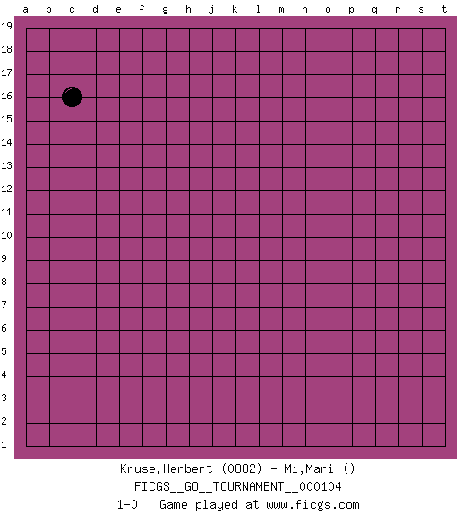 Last move : 1-0 2022 August 18 23:39:32 [Event "FICGS__GO__TOURNAMENT__000104"] [Site "FICGS"] [Date "2022.07.19"] [Round "1"] [Black "Kruse,Herbert"] [White "Mi,Mari"] [Result "1-0"] [Rating 1 "0882"] 1.c16 1-0 This go game has been lost on time (started : 2022.07.19 14:37:12) Follow this game move after move (download)You don't have to be really good anymore to get good results. What's happening with chess is that it's gradually losing its place as the par excellence of intellectual activity. Smart people in search of a challenging board game might try a game called Go. (Hans Berliner, The New York Times, 2003) The human is the only animal species whose members are able to talk themselves into difficulties that would not otherwise exist. (Wendell Johnson)