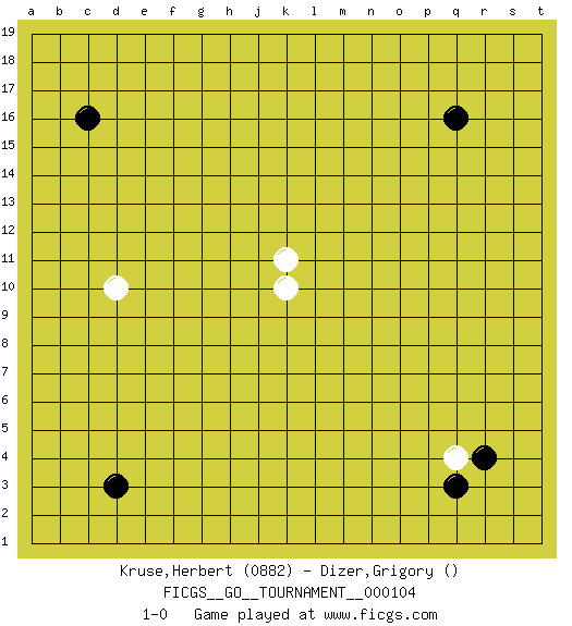 Last move : 1-0 2022 July 31 15:58:44 [Event "FICGS__GO__TOURNAMENT__000104"] [Site "FICGS"] [Date "2022.07.19"] [Round "1"] [Black "Kruse,Herbert"] [White "Dizer,Grigory"] [Result "1-0"] [Rating 1 "0882"] 1.c16 k10 2.q16 d10 3.d3 k11 4.q3 q4 5.r4 1-0 Follow this game move after move (download)Error is one of the sources of transformation. (Pierre Audouard) Never risk one's whole fortune unless supported by one's entire army. (Niccolo Machiavelli)
