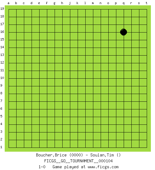 Last move : 1-0 2022 August 20 0:34:45 [Event "FICGS__GO__TOURNAMENT__000104"] [Site "FICGS"] [Date "2022.07.19"] [Round "1"] [Black "Boucher,Brice"] [White "Soulan,Tim"] [Result "1-0"] [Rating 1 "0000"] 1.q16 1-0 This go game has been lost on time (started : 2022.07.19 14:37:12) Follow this game move after move (download)Never try to cut bamboo joints. (Anonymous) All art requires courage. (Anne Tucker)
