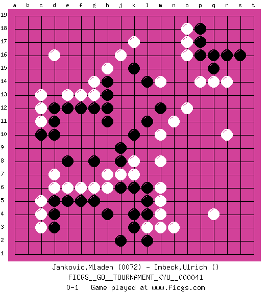 Last move : 0-1 2007 October 6 12:37:18 [Event "FICGS__GO__TOURNAMENT_KYU__000041"] [Site "FICGS"] [Date "2007.08.03"] [Round "1"] [Black "Jankovic,Mladen"] [White "Imbeck,Ulrich"] [Result "0-1"] [Rating 1 "0072"] 1.d4 q4 2.q16 d16 3.d10 r14 4.r16 r10 5.k4 k17 6.k10 c11 7.c10 l3 8.k3 n3 9.h4 c13 10.h14 o16 11.k15 m14 12.l14 d7 13.e8 c5 14.d5 c4 15.d3 c3 16.l5 k8 17.j9 g13 18.h12 m8 19.m12 m10 20.l11 j16 21.h13 g14 22.g12 h15 23.h11 m6 24.l6 m5 25.l4 m4 26.l2 m3 27.j2 j7 28.f12 f13 29.e12 e13 30.d11 c12 31.d12 o12 32.p17 o17 33.p18 o18 34.p16 p14 35.q15 q14 36.s16 h6 37.j8 k7 38.g8 d6 39.e5 f6 40.f5 e6 41.g5 g6 42.j6 h7 43.k6 n11 0-1 Here are the names of the openings (joseki) played in the four corners : Corner q16 : q16 r14 Hoshi (Hwajeom, Seongjeom, Xingwei`) 4-4 Point. The star or hoshi (4-4) point, emphasizing influence at the potential expense of territory. Ikken Kakari (Hankan Keolch'im, Yi Gua`jiao~, 1-Space Low Approach). White 2 is the standard approach move to the 4-4. Player White won this Go (weiqi, baduk) game. Follow this game move after move (download)One big eye kills one small eye. (Anonymous) Life is pleasant. Death is peaceful. It's the transition that's troublesome. (Isaac Asimov)