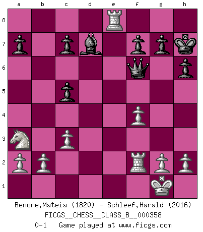 Last move : 0-1 2022 December 21 1:49:20 [Event "FICGS__CHESS__CLASS_B__000358"] [Site "FICGS"] [Date "2022.07.23"] [Round "1"] [White "Benone,Mateia"] [Black "Schleef,Harald"] [Result "0-1"] [WhiteElo "1820"] [BlackElo "2016"] 1.e4 e5 2.Nf3 Nc6 3.d4 exd4 4.Nxd4 Bc5 5.Be3 Qf6 6.c3 Nge7 7.Bc4 O-O 8.O-O b6 9.Nc2 Bb7 10.f4 d5 11.exd5 Na5 12.Nd2 Nxc4 13.Nxc4 Rfd8 14.Bxc5 bxc5 15.Qg4 Nxd5 16.Rae1 Ba6 17.N2a3 Nb6 18.Qe2 h6 19.Rf2 Rab8 20.Qe4 Bb7 21.Qe5 Re8 22.Qxe8+ Rxe8 23.Rxe8+ Kh7 24.Nxb6 Bc6 25.Nd7 Bxd7 0-1 Follow this game move after move (download)A strong memory, concentration, imagination, and a strong will is required to become a great Chess player. (Bobby Fischer) Ja, jede Frau in Holland liebt mich bestimmt, und alle Männer hassen mich. (Loek van Wely) Debió haber existido una vez en que los hombres eran semidióses, de otra manera no hubiesen podido inventar el Ajedrez. (Gustav Schenk) La conception d'un plan est le processus par lequel un joueur exploite les avantages de sa position tout en s'efforçant d'en réduire au minimum les inconvénients. Afin de garantir le succès, un plan doit toujours se fonder sur un diagnostic objectif des particularités d'une position. La conception d'un plan est d'autant plus difficile que la position est équilibrée, et grandement facilitée lorsqu'il n'existe qu'un seul plan susceptible de répondre aux exigences de la position. (Harry Golombek) If you have any trouble condescending, find a Unix user to show you how it's done. (Scott Adams)