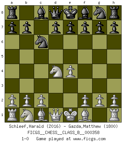 Last move : 1-0 2022 September 1 20:57:13 [Event "FICGS__CHESS__CLASS_B__000358"] [Site "FICGS"] [Date "2022.07.23"] [Round "1"] [White "Schleef,Harald"] [Black "Gazda,Matthew"] [Result "1-0"] [WhiteElo "2016"] [BlackElo "1800"] 1.e4 c5 2.Nf3 Nc6 3.d4 cxd4 4.Nxd4 1-0 This chess game has been lost on time (started : 2022.07.23 9:7:4) Follow this game move after move (download)Whoever sees no other aim in the game than that of giving checkmate to one's opponent will never become a good Chess player. (Euwe) Ich liebe den Moment, wenn ich das Ego meines Gegenüber breche. (Robert James Fischer) Creo que una cierta cantidad de temperamento es esperada de los genios del Ajedrez. (Ron Gross) Vous m'avez demandé de vous exposer quel est le fondement de la prière. Je ne fais que préparer les pièces du jeu sur la table... Nous sera-t-il permis d'en adopter les règles et si nous les appliquons scrupuleusement nous ne tarderons pas à faire mat le Roi divin ! Il ne pourra échapper à nos mains. (Sainte Thérèse d'Avila, Chemin de perfection) To steal ideas from one person is plagiarism. To steal from many is research. (Unknown)