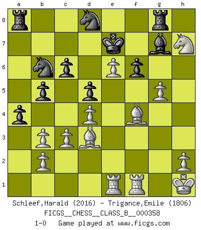 Last move : 1-0 2022 August 27 13:8:16 [Event "FICGS__CHESS__CLASS_B__000358"] [Site "FICGS"] [Date "2022.07.23"] [Round "1"] [White "Schleef,Harald"] [Black "Trigance,Emile"] [Result "1-0"] [WhiteElo "2016"] [BlackElo "1806"] 1.d4 c6 2.e4 d5 3.e5 Bf5 4.c3 e6 5.Be3 Qb6 6.Qb3 Qxb3 7.axb3 Bxb1 8.Rxb1 a5 9.Bd3 f6 10.f4 Nd7 11.Nf3 Nh6 12.O-O Nf7 13.f5 Nd8 14.exf6 gxf6 15.Bf4 Kf7 16.Rbe1 b5 17.Ng5+ Ke7 18.fxe6 Nb6 19.Nxh7 Bg7 20.g4 Rg8 21.Kh1 a4 22.g5 1-0 Follow this game move after move (download)Best by test: 1. e4 (Bobby Fischer) Du musst nicht gut spielen, es reicht, wenn du besser spielst als dein Gegner. (Anonymous) Vive, pierde y aprende al observar a tu oponente como gana. (Amber Steenbock) Il a essayé de se convaincre qu'il pourrait empêcher toutes les erreurs et ne jamais perdre. L'horreur ! Gary Kasparov au sujet de Robert Fischer. Wikichess, chess moves explained by 'experimented' players. (Thibault de Vassal)