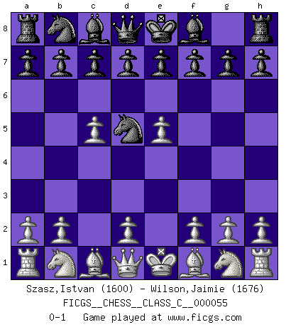 Last move : 0-1 2007 September 15 20:30:45 [Event "FICGS__CHESS__CLASS_C__000055"] [Site "FICGS"] [Date "2007.08.05"] [Round "1"] [White "Szasz,Istvan"] [Black "Wilson,Jaimie"] [Result "0-1"] [WhiteElo "1600"] [BlackElo "1676"] 1.e4 Nf6 2.e5 Nd5 3.c4 Nb6 4.c5 Nd5 0-1 This chess game has been lost on time (started : 2007.08.05 7:28:18) Alekhine's defense : Two pawns' (Lasker's) attack Player Black won this chess game. Follow this game move after move (download)Fischer is under obligation to nobody. (Joseph Platz) Man gibt nur Pakete auf. (Paul Keres) Aquellos que dicen entender al Ajedrez, no entienden nada. (Robert Hubner) Mon pion favori sur ma case favorite ! Bronstein en parlant d'un coup de pion en h5 quand il avait les Noirs. Information on the Internet is subject to the same rules and regulations as conversation at a bar. (George Lundberg)