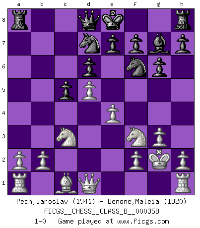 Last move : 1-0 2022 December 3 0:10:8 [Event "FICGS__CHESS__CLASS_B__000358"] [Site "FICGS"] [Date "2022.07.23"] [Round "1"] [White "Pech,Jaroslav"] [Black "Benone,Mateia"] [Result "1-0"] [WhiteElo "1941"] [BlackElo "1820"] 1.d4 Nf6 2.c4 c5 3.d5 b5 4.cxb5 a6 5.bxa6 Bxa6 6.Nc3 g6 7.e4 Bxf1 8.Kxf1 d6 9.Nf3 Nbd7 10.g3 Bg7 11.Kg2 1-0 This chess game has been lost on time (started : 2022.07.23 9:7:4) Follow this game move after move (download)Pawns are born free, yet they are everywhere in chains. (Rick Kennedy) Das typische an einem Großmeister ist, daß er eine gewonnene Position schnell und schmerzlos gewinnt. (Irving Chernev) Yo nunca en mi vida he jugado la Defensa Francesa, que viene siendo la más aburrida de todas las Aperturas. (Wilhelm Steinitz) On entre au jeu d'Echecs comme on entre en Religion. Pour le joueur d'Echecs, la partie d'Echecs c'est l'office, la messe, le défilé du 1er Mai, le dépôt de gerbe au Monument aux Morts. C'est un drame sacré. (Michel Roos) If computers get too powerful, we can organize them into committees. That'll do them in. (Anonymous)
