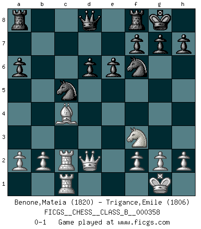 Last move : 0-1 2022 November 17 12:43:23 [Event "FICGS__CHESS__CLASS_B__000358"] [Site "FICGS"] [Date "2022.07.23"] [Round "1"] [White "Benone,Mateia"] [Black "Trigance,Emile"] [Result "0-1"] [WhiteElo "1820"] [BlackElo "1806"] 1.e4 a6 2.d4 b5 3.c4 Bb7 4.Bd3 bxc4 5.Bxc4 Bxe4 6.Nf3 e6 7.Nbd2 Bxf3 8.Nxf3 Bb4+ 9.Bd2 Bxd2+ 10.Qxd2 Nf6 11.O-O d6 12.Rac1 O-O 13.Rc2 Nbd7 14.Rfc1 c5 15.dxc5 Nxc5 0-1 This chess game has been lost on time (started : 2022.07.23 9:7:4) Follow this game move after move (download)Man is a frivolous, a specious creature, and like a Chess player, cares more for the process of attaining his goal than for the goal itself. (Dostoyevsky) Kritik überlasse ich den Spießern. Ich zeige nichts, wofür ich mich schämen muss. (Alexandra Kosteniuk) Alguna parte de un error es siempre correcto. (Savielly Tartakover) Je crois qu'il existe des manières très spécifiques de jouer efficacement contre une machine. Evidemment, nous n'avons aucune chance en technique pure, parce que l'ordinateur calcule de manière parfaite. Mais lorsque nous faisons appel à notre cerveau, en utilisant l'intuition et la compréhension, alors nous restons beaucoup plus forts. (Anatoli Karpov) For peace of mind, resign as general manager of the universe. (Douglas Adams)