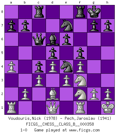 Last move : 1-0 2022 December 2 23:13:16 [Event "FICGS__CHESS__CLASS_B__000358"] [Site "FICGS"] [Date "2022.07.23"] [Round "1"] [White "Voudouris,Nick"] [Black "Pech,Jaroslav"] [Result "1-0"] [WhiteElo "1978"] [BlackElo "1941"] 1.d4 d5 2.e3 Nf6 3.f4 c5 4.c3 Nc6 5.Bd3 Bg4 6.Nf3 e6 7.O-O Bd6 8.Qe1 O-O 9.Ne5 Bf5 10.Qe2 Qb6 11.Kh1 Ne7 12.Nd2 Rac8 13.a4 Rfd8 14.Ndf3 c4 15.Bc2 Bxc2 16.Qxc2 Ne4 17.Ng4 Rf8 18.Nf2 f5 19.Bd2 Qc6 20.Qd1 1-0 Follow this game move after move (download)It is not a move, even the best move that you must seek, but a realizable plan. (Eugene Znosko-Borovsky) Dass jemand wie Surab Asmaiparaschwili, der selbst Elopunkte gekauft hat , Vize-Präsident der Fide werden konnte, sagt schon einges über den Zustand dieser Organisation aus. (Joel Lautier) Todos los Maestros de Ajedrez fueron un día unos principiantes. (Chernev) Aidez vos pièces, elles vous aideront. (Paul Morphy) Sometimes it pays to stay in bed in Monday, rather than spending the rest of the week debugging Monday's code. (Dan Salomon)