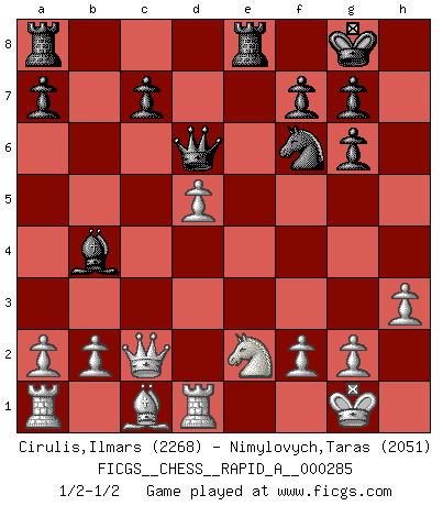 Last move : 1/2-1/2 2022 August 31 11:55:17 [Event "FICGS__CHESS__RAPID_A__000285"] [Site "FICGS"] [Date "2022.07.25"] [Round "1"] [White "Cirulis,Ilmars"] [Black "Nimylovych,Taras"] [Result "1/2-1/2"] [WhiteElo "2268"] [BlackElo "2051"] 1.e4 e5 2.Nc3 Nf6 3.Nf3 Nc6 4.d4 exd4 5.Nxd4 Bb4 6.Nxc6 bxc6 7.Bd3 d5 8.exd5 O-O 9.O-O Bg4 10.Ne2 cxd5 11.h3 Bh5 12.c4 Re8 13.Qc2 Bg6 14.Rd1 Qd6 15.Bxg6 hxg6 16.cxd5 1/2-1/2 Follow this game move after move (download)He who fears an isolated Queen's Pawn should give up Chess. (Siegbert Tarrasch) Als er Schachweltmeister wurde ließ er praktisch alle stärksten Sovietspieler für sich arbeiten. Wenn ein auch nur mittelmässiger Meister ein Spezialist für eine bestimmte Eröffnung war, wurde er von Karpov gerufen. Das wurde alles geheim gehalten. (Mikhail Moiseyevich Botvinik) Aún el Rey más flojo huye despavorido ante la amenaza de un Jaque doble. (Aaron Nimzowitsch) Vous m'avez demandé de vous exposer quel est le fondement de la prière. Je ne fais que préparer les pièces du jeu sur la table... Nous sera-t-il permis d'en adopter les règles et si nous les appliquons scrupuleusement nous ne tarderons pas à faire mat le Roi divin ! Il ne pourra échapper à nos mains. (Sainte Thérèse d'Avila, Chemin de perfection) Follow your passion, and success will follow you. (Arthur Buddhold)