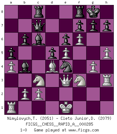Last move : 1-0 2022 August 31 14:24:45 [Event "FICGS__CHESS__RAPID_A__000285"] [Site "FICGS"] [Date "2022.07.25"] [Round "1"] [White "Nimylovych,Taras"] [Black "Cleto Junior,Dirceu"] [Result "1-0"] [WhiteElo "2051"] [BlackElo "2079"] 1.e4 e6 2.Nc3 d5 3.d4 Nf6 4.e5 Nfd7 5.f4 c5 6.Nf3 Nc6 7.Be3 Be7 8.a3 b6 9.Bb5 Bb7 10.Qe2 a6 11.Bxc6 Bxc6 12.h4 a5 13.h5 O-O 14.a4 Qc7 15.g4 cxd4 16.Bxd4 Nc5 17.f5 Ne4 18.Qe3 Rac8 19.Rh3 Bb4 20.f6 1-0 Follow this game move after move (download)A Chess game is divided into three stages: the first, when you hope you have the advantage, the second when you believe you have an advantage, and the third... when you know you're going to lose ! (Savielly Tartakower) Im Schach gewinnt jeder. Hat man Freunde am Spiel - und das ist die Hauptsache - ist auch der Verlust einer Partie kein Unglück. (David Bronstein) Aún deseo matar a Fischer. (Boris Spassky) Karpov est une pièce de musée. (Garry Kasparov) It is the aim of the modern school, not to treat every position according to one general law, but according to the principle inherent in the position. (Richard Reti)