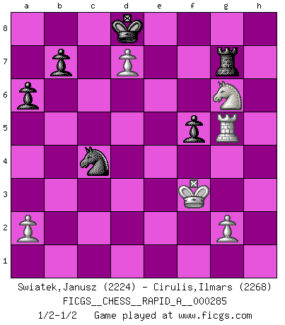 Last move : 1/2-1/2 2022 August 31 20:54:0 [Event "FICGS__CHESS__RAPID_A__000285"] [Site "FICGS"] [Date "2022.07.25"] [Round "1"] [White "Swiatek,Janusz"] [Black "Cirulis,Ilmars"] [Result "1/2-1/2"] [WhiteElo "2224"] [BlackElo "2268"] 1.d4 d5 2.c4 c6 3.cxd5 cxd5 4.Bf4 Nc6 5.Nc3 Bf5 6.e4 Bxe4 7.Nxe4 e5 8.dxe5 dxe4 9.Bc4 Bb4+ 10.Kf1 Qxd1+ 11.Rxd1 Nge7 12.e6 f5 13.Ne2 Rd8 14.Rxd8+ Kxd8 15.h4 Na5 16.Bb5 a6 17.Bd7 Nc4 18.Rh3 Nd5 19.Bg5+ Be7 20.Nf4 Ndb6 21.Rg3 Bxg5 22.Rxg5 g6 23.h5 Rg8 24.hxg6 hxg6 25.Nxg6 Nxd7 26.exd7 Nxb2 27.Ke2 Rg7 28.f4 exf3+ 29.Kxf3 Nc4 1/2-1/2 Follow this game move after move (download)Chess is above all, a fight ! (Emanuel Lasker) Ich suche im Schach immer etwas Eigenes. Riskantes Spiel im Stile schachlicher Musketiere ist nicht meine Sache, auch wenn es vielen Freunden scharfer Wendungen gefällt. (Anatoly Karpov) Antes de los Finales, los dioses han colocado el Juego Medio. (Siegbert Tarrasch) Les Echecs représentent une sphère d'idées créatrices basée sur la volonté des deux protagonistes. (Smyslov) Any activity becomes creative when the doer cares about doing it right or doing it better. (John Updike)