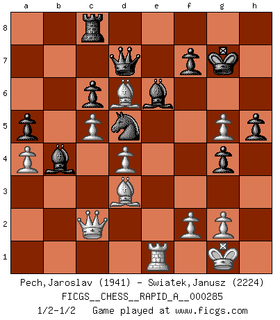 Last move : 1/2-1/2 2022 November 1 16:10:24 [Event "FICGS__CHESS__RAPID_A__000285"] [Site "FICGS"] [Date "2022.07.25"] [Round "1"] [White "Pech,Jaroslav"] [Black "Swiatek,Janusz"] [Result "1/2-1/2"] [WhiteElo "1941"] [BlackElo "2224"] 1.e4 c6 2.d4 d5 3.Nc3 dxe4 4.Nxe4 Nf6 5.Nxf6+ exf6 6.c3 g6 7.Bd3 Bg7 8.Nf3 O-O 9.O-O Re8 10.Bf4 a5 11.h3 Na6 12.Qd2 Nc7 13.Rfe1 Rxe1+ 14.Rxe1 Nd5 15.Bh2 b5 16.b3 Bf8 17.a4 Bd7 18.Rb1 Rc8 19.Bg3 Be6 20.Be4 Kg7 21.Ra1 h5 22.c4 Bb4 23.Qc2 Nc3 24.Bd3 g5 25.Re1 bxc4 26.bxc4 Qd7 27.h4 g4 28.Ng5 fxg5 29.hxg5 Kf8 30.c5 Nd5 31.Bd6+ Kg7 32.Be5+ Kf8 33.Bd6+ Kg7 1/2-1/2 Follow this game move after move (download)Up to this point White has been following well-known analysis. But now he makes a fatal error: he begins to use his own head. (Siegbert Tarrasch) Ich würde mich als ganz normalen Jungen bezeichnen [Im Alter von 12]. (Sergej Karjakin) Cuando tengas duda... ¡juega al Ajedrez!. (Tevis) Les Cavaliers se révèlent fort utiles dans les positions fermées. D'habitude, les Fous sont un peu plus forts que les Cavaliers dans les positions ouvertes. Qu'on le veuille ou non, il restera toujours des exceptions ! Luck is what you have left over after you give 100 percent. (Langston Coleman)