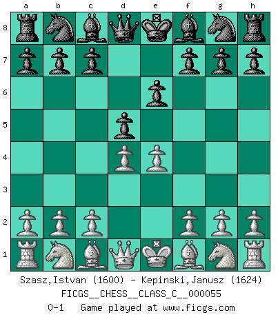 Last move : 0-1 2007 September 19 14:59:11 [Event "FICGS__CHESS__CLASS_C__000055"] [Site "FICGS"] [Date "2007.08.05"] [Round "1"] [White "Szasz,Istvan"] [Black "Kepinski,Janusz"] [Result "0-1"] [WhiteElo "1600"] [BlackElo "1624"] 1.e4 e6 2.d4 d5 0-1 This chess game has been lost on time (started : 2007.08.05 7:28:18) French defense Player Black won this chess game. Follow this game move after move (download)Let the perfectionist play postal. (Yasser Seirawan) Es gibt zwei Arten von Opfern: Korrekte und meine. (Mikhail Nekhemyevich Tal) El Ajedrez es parte de la cultura, y si una cultura esta en decadencia, entonces también el Ajedrez declinará. (Mikhail Botvinnik) Une platitude souvent récitée à propos des Echecs est qu'une des choses les plus difficiles à réaliser est de gagner une position gagnante. Cela ne manque pas de sens mais, pour ma part, j'ai toujours trouvé plus difficile de gagner une position perdante. (Tim Krabbe) Luck never made a man wise. (Seneca, Letters to Lucilius)