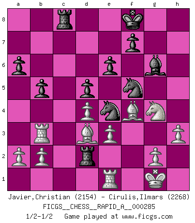 Last move : 1/2-1/2 2022 September 29 2:22:47 [Event "FICGS__CHESS__RAPID_A__000285"] [Site "FICGS"] [Date "2022.07.25"] [Round "1"] [White "Javier,Christian"] [Black "Cirulis,Ilmars"] [Result "1/2-1/2"] [WhiteElo "2154"] [BlackElo "2268"] 1.d4 d5 2.c4 c6 3.cxd5 cxd5 4.Bf4 Nc6 5.e3 Nf6 6.Nc3 Bf5 7.Be2 e6 8.Nf3 Bb4 9.O-O O-O 10.Rc1 Rc8 11.h3 Bxc3 12.Rxc3 Ne4 13.Ra3 a6 14.Nd2 Na7 15.Re1 Qe7 16.Rb3 Rc6 17.Nf3 g5 18.Bh2 Rfc8 19.Ne5 Rc2 20.Ng4 Rd2 21.Qb1 Kg7 22.Bd3 h5 23.Be5+ Kf8 24.Nh6 Bg6 25.f3 g4 26.fxg4 hxg4 27.Nxg4 Qh4 28.Rf1 Nc6 29.Bf4 b5 30.Qc1 Ne7 31.Qe1 Qxe1 32.Rxe1 Nf5 1/2-1/2 Follow this game move after move (download)Good positions don't win games, good moves do. (Gerald Abrahams) Ein guter Spieler hat immer Glück. (José Raúl Capablanca) El Ajedrez es la vida. (Bobby Fischer) En blitz, le Cavalier l'emporte sur le Fou. (Vlastimil Hort) A good teacher is like a candle - it consumes itself to light the way for others. (Author unknown)