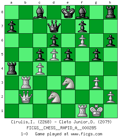 Last move : 1-0 2022 August 10 21:40:23 [Event "FICGS__CHESS__RAPID_A__000285"] [Site "FICGS"] [Date "2022.07.25"] [Round "1"] [White "Cirulis,Ilmars"] [Black "Cleto Junior,Dirceu"] [Result "1-0"] [WhiteElo "2268"] [BlackElo "2079"] 1.d4 Nf6 2.c4 c5 3.d5 b5 4.Nf3 Bb7 5.a3 Qa5+ 6.Bd2 b4 7.Bg5 h6 8.Bxf6 exf6 9.g3 Na6 10.e4 g6 11.Bd3 Be7 12.Nbd2 bxa3 13.Rxa3 Qc7 14.Nh4 Nb4 15.O-O Nxd3 16.Rxd3 d6 17.f4 Bc8 18.f5 g5 19.Ng2 Rb8 20.e5 fxe5 21.f6 Bf8 22.Ne3 Rxb2 23.Qa4+ Qd7 24.Qa1 Rb4 25.Rb3 Ra4 26.Qb2 1-0 Follow this game move after move (download)When you are lonely, when you feel yourself an alien in the world, play Chess. This will raise your spirits and be your counselor in war. (Aristotle) Was ist der Unterschied zwischen einem Strassenarbeiter und einem Schachspieler? --Der Schachspieler bewegt sich ab und zu. (Anonymous) Una buena memoria, concentración, imaginación y una fuerte voluntad, se requiere para llegar a ser un buen jugador. (Bobby Fischer) Je ne suis pas le dernier à jouer lâchement des coups douteux pendant le zeïtnot de l'adversaire pour l'achever: en effet les coups qui font le plus peur sont ceux que l'on ne comprend pas. Je me fais souvent peur quand je joue. (Un professeur anonyme) Every now and then a man's mind is stretched by a new idea and never shrinks back to its former dimensions. (Oliver Wendell Holmes, Sr.)
