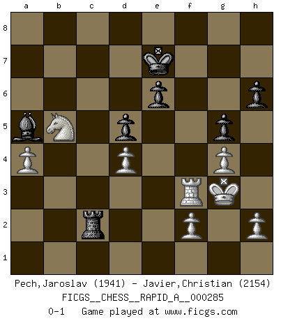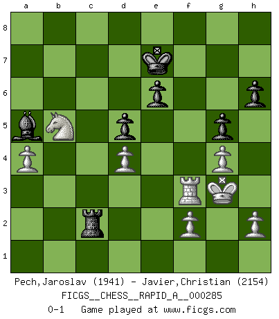 Last move : 0-1 2022 November 16 3:47:4 [Event "FICGS__CHESS__RAPID_A__000285"] [Site "FICGS"] [Date "2022.07.25"] [Round "1"] [White "Pech,Jaroslav"] [Black "Javier,Christian"] [Result "0-1"] [WhiteElo "1941"] [BlackElo "2154"] 1.d4 d5 2.c4 e6 3.Nc3 Be7 4.Bf4 Nf6 5.Nf3 O-O 6.e3 Nbd7 7.c5 c6 8.Bd3 Nh5 9.O-O Nxf4 10.exf4 b6 11.b4 a5 12.a3 Ba6 13.Bxa6 Rxa6 14.Qe2 Qa8 15.b5 cxb5 16.Qxb5 Ra7 17.c6 Nb8 18.Rfc1 Rc7 19.Ne5 Rfc8 20.Qxb6 Nxc6 21.Nb5 Rb7 22.Nxc6 Bf8 23.Ne7+ Bxe7 24.Rxc8+ Qxc8 25.Qxa5 Bd8 26.Qa6 Rb8 27.Qxc8 Rxc8 28.f5 g5 29.g4 Kg7 30.a4 Ba5 31.Nd6 Rb8 32.fxe6 fxe6 33.Nb5 Rc8 34.Kg2 Rc2 35.Kg3 Kf6 36.Ra3 h6 37.Rf3+ Ke7 0-1 Follow this game move after move (download)We like to think. (Gary Kasparov) Schach ist das schnellste Spiel der Welt, weil man in jeder Sekunde Tausende von Gedanken ordnen muß. (Albert Einstein) a manera como él juega al Ajedrez, demuestra la completa naturaleza de un hombre. (Stanley Ellin) Des combinaisons [dans le jeu d'échecs] pareilles à des mélodies. Je crois entendre pour ainsi dire la musique des coups... (Vladimir Nabokov) The large trees attract high winds. (Chinese proverb)
