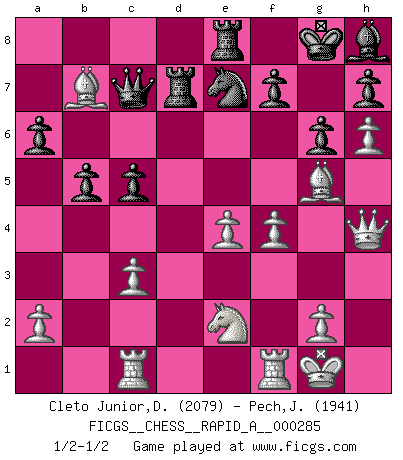 Last move : 1/2-1/2 2022 September 17 6:20:40 [Event "FICGS__CHESS__RAPID_A__000285"] [Site "FICGS"] [Date "2022.07.25"] [Round "1"] [White "Cleto Junior,Dirceu"] [Black "Pech,Jaroslav"] [Result "1/2-1/2"] [WhiteElo "2079"] [BlackElo "1941"] 1.d4 Nf6 2.c4 g6 3.Nc3 d5 4.cxd5 Nxd5 5.e4 Nxc3 6.bxc3 Bg7 7.Bc4 c5 8.Ne2 Nc6 9.Be3 O-O 10.O-O Qc7 11.Rc1 Rd8 12.h4 e6 13.Bg5 Rd7 14.Qe1 a6 15.d5 exd5 16.Bxd5 b5 17.h5 Bb7 18.h6 Bh8 19.f4 Re8 20.Qh4 Ne7 21.Bxb7 1/2-1/2 Follow this game move after move (download)Openings teach you openings. Endgames teach you chess ! (Stephan Gerzadowicz) Ein Großmeister muß tausende Partien in seinem Kopf speichern, denn diese sind für Ihn, was die Worte der Muttersprache für gewöhnliche Leute sind, oder Noten für Musiker... (Garry Kasparov) El Ajedrez es un expediente tonto que hace creer a la gente inactiva que hacen una cosa muy astuta cuando solamente estan perdiendo su tiempo. (George Bernard Shaw) Shah mat. Le roi est mort. Cri de fierté d'un joueur venant de terrasser son adversaire, courtoisement, sans effusion de sang. Beep ! (R2D2 in Star Wars ep.3)