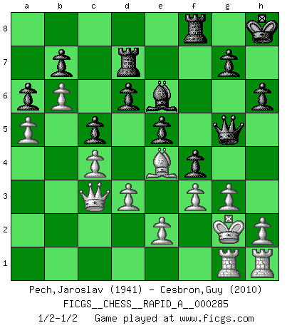 Last move : 1/2-1/2 2022 October 26 2:16:3 [Event "FICGS__CHESS__RAPID_A__000285"] [Site "FICGS"] [Date "2022.07.25"] [Round "1"] [White "Pech,Jaroslav"] [Black "Cesbron,Guy"] [Result "1/2-1/2"] [WhiteElo "1941"] [BlackElo "2010"] 1.c4 e5 2.Nc3 Nf6 3.Nf3 Nc6 4.g3 Nd4 5.Bg2 Nxf3+ 6.Bxf3 Bb4 7.Qb3 Bc5 8.O-O c6 9.d3 O-O 10.Bg5 h6 11.Bxf6 Qxf6 12.Ne4 Qe7 13.Nxc5 Qxc5 14.Qc3 Qe7 15.b4 d6 16.Rfb1 f5 17.a4 f4 18.b5 c5 19.a5 Rb8 20.Be4 Be6 21.f3 Kh8 22.Kg2 Qf7 23.b6 a6 24.Rh1 Qe7 25.Rag1 Rbd8 26.Kf2 Rd7 27.Kg2 Qg5 1/2-1/2 Follow this game move after move (download)Chess is a matter of delicate judgment, knowing when to punch and how to duck. (Bobby Fischer) Ich erzeugte keinen Neid, da mich die Schachspieler als Musiker und die Musiker als Schachspieler betrachteten. (Mark Taimanov) La batalla por la última verdad nunca sera ganada. Y es por eso que el Ajedrez es tan fascinante. (Hans Kmoch) Tous ces prétendus hommes politiques sont les pions, les Cavaliers, les Tours ou les Fous d'une partie d'échecs qui se jouera tant qu'un hasard ne renversera pas l'échiquier. (Honoré de Balzac) If you don't practice you don't deserve to win. (Andre Agassi)
