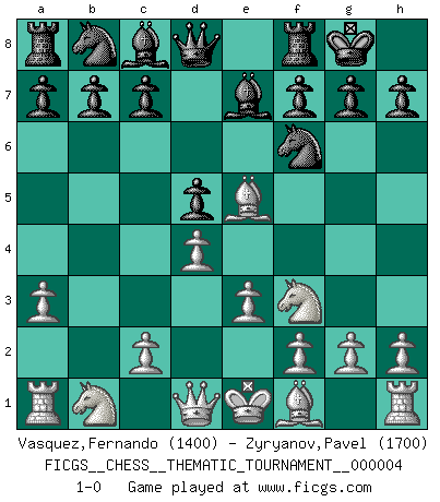 Last move : 1-0 2006 August 24 6:34:41 [Event "FICGS__CHESS__THEMATIC_TOURNAMENT__000004"] [Site "FICGS"] [Date "2006.06.28"] [Round "1"] [White "Vasquez,Fernando"] [Black "Zyryanov,Pavel"] [Result "1-0"] [WhiteElo "1400"] [BlackElo "1700"] 1.b4 e5 2.Bb2 Bxb4 3.Bxe5 Nf6 4.a3 Be7 5.e3 O-O 6.Nf3 d5 7.d4 1-0 This chess game has been lost on time (started : 2006.06.28 11:29:44) Polish (Sokolsky) opening Kingside Castling by player Black (move 5) Player White won this chess game. Follow this game move after move (download)With or without the title, Bobby Fischer was unquestionably the greatest player of his time. (Burt Hochberg) Wenn du gegen Bobby spielst, ist es keine Frage von gewinnen oder verlieren. Es ist eine Frage des Überlebens. (Boris Vassilievich Spassky) Existen dos clases de sacrificios: los correctos y los míos. (Mikhail Tal) La guerre est enfant de la passion, la passion est enfant du narcissisme et le narcissisme est l'enfant. (...) Une autre partie ? (Thibault de Vassal) When a man with money meets a man with experience, the man with experience leaves with money and the man with money leaves with experience. (Anonymous)